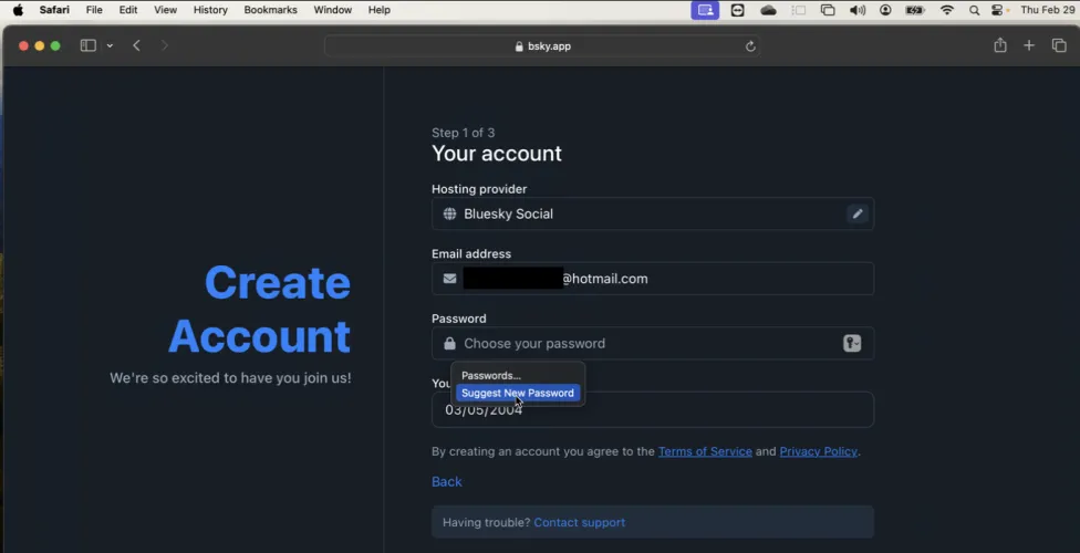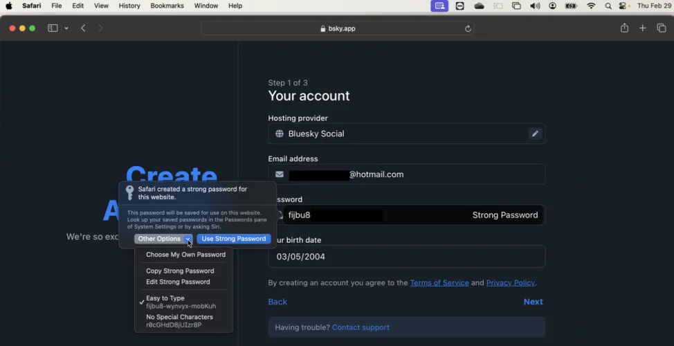 要在Mac上创建新帐户的凭据,请在Safari中启动该网站。选择创建新帐户的选项,然后输入您的用户名和密码。单击Password字段中的KeyChain图标,然后选择Suggest New Password选项。