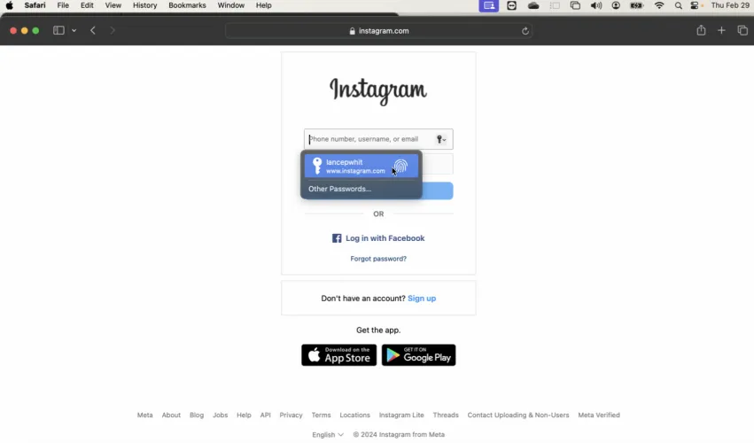 要在Mac上自动填写密码,请浏览到保存了您的凭据的站点。在用户名字段中单击。在该字段中会出现一个提示,其中包含帐户的名称。点击该名称,然后输入您的Mac密码或使用Touch ID。系统会自动插入您的凭据,允许您登录该站点。