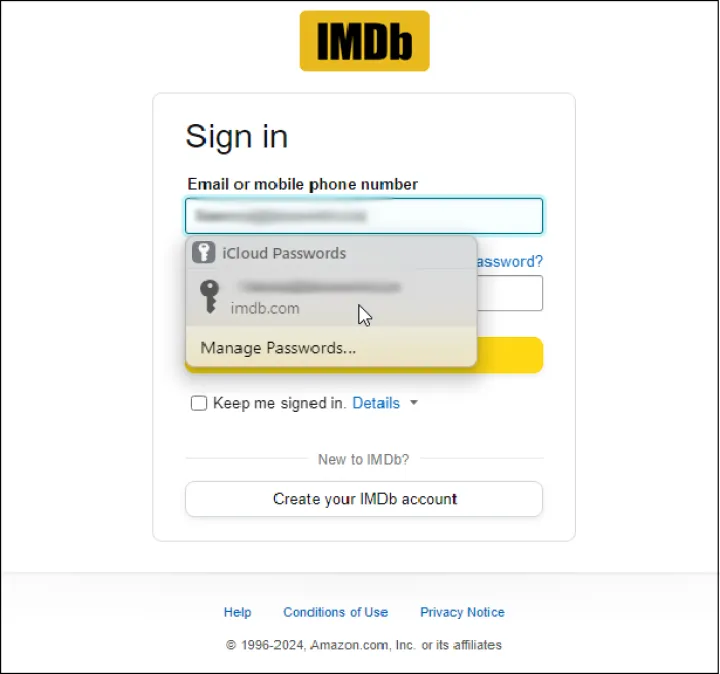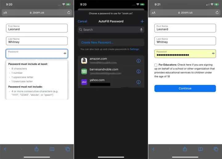 返回到站点的帐户设置过程。在Username字段中单击并选择您刚刚创建的条目。然后,您可以完成新帐户的设置。要自动填写密码,请浏览到具有保存凭据的站点。在用户名字段中单击,选择您保存的帐户,然后登录。
