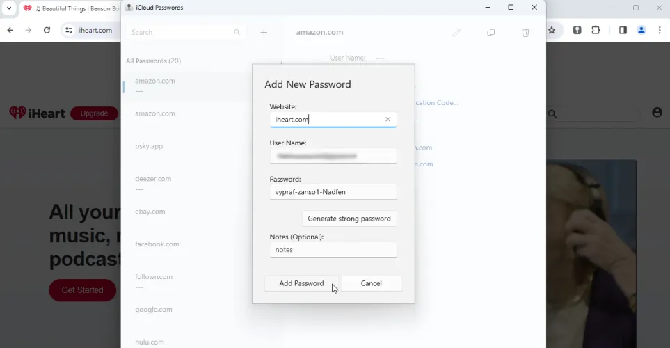 在iCloud密码窗口中,单击左窗格顶部的加号图标,然后键入站点地址和您的用户名。单击生成强密码以创建密码。您可以继续单击该按钮以生成不同的密码。满意后,单击添加密码。