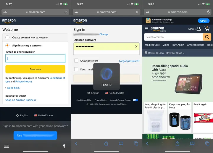 现在,当你返回到你有账户的网站时,选择登录选项,你应该会在屏幕底部收到一个提示,询问你是否想用你保存的密码登录到该网站。点击显示用户名或帐户名的按钮,然后通过密码、Face ID或Touch ID进行身份验证,然后您就可以登录到该站点。
