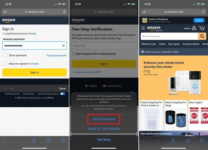 在你的iPhone或iPad上启动Safari,然后浏览到你已经有账户的网站。输入您的用户名和密码,应该会弹出一个提示,询问您是否要将此密码保存在您的iCloud钥匙链中。点击保存密码。密码已保存,您已登录到该网站。