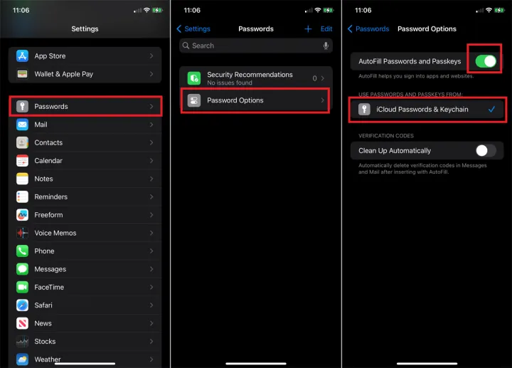 确保将iCloud钥匙串设置为默认密码选项。在iPhone或iPad上,进入设置>密码。验证访问,然后选择密码选项。确保自动填充密码和密匙旁边的开关处于打开状态,并且选中了iCloud密码和钥匙链。