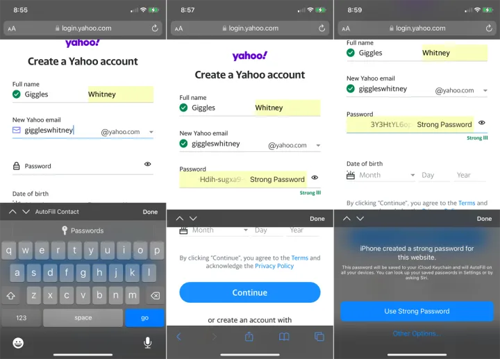 如果你需要创建一个新帐户,许多网站都会允许iCloud Keychain自动创建并显示建议的密码。如果您喜欢该密码,并且它符合网站的要求,请点击使用强密码。否则,请点击其他选项。