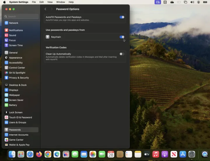 在装有MacOS Ventura或更高版本的Mac上,进入系统设置>密码>密码选项。打开自动填充密码和密匙和钥匙链旁边的开关。
