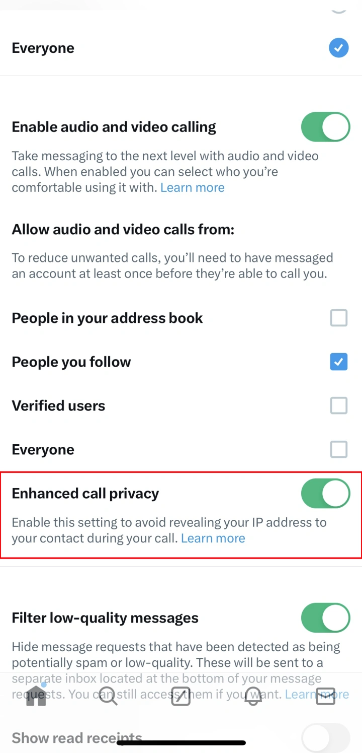 当您点击增强的隐私下的了解更多,您会看到:“增强的呼叫隐私是X上的一项新设置,有助于保护您的隐私。启用此设置后,您的IP地址将对您呼叫和接收其呼叫的人隐藏。具体地说,如果呼叫双方都禁用了此设置(这是默认设置),一旦我们的服务器促进了初始设置,呼叫本身就会被对等路由,这样每一方的IP地址对另一方都是可见的。但是,如果任何一方启用了此设置,则双方之间的呼叫将通过X基础设施进行中继,并且启用此设置的任何一方的IP地址都将被屏蔽。