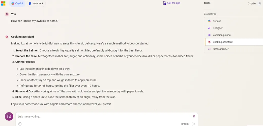 就其本身而言,Copilot将提供许多有用的一般信息,但您可以通过GPTS将其用于更具体的请求。在Copilot网站上,点击右上角的聊天标题。在下面的部分,你会发现副驾驶GPT的技能,如设计师,度假策划人,烹饪助理,和健身教练。选择您想要的GPT,并提交与该主题相关的问题。