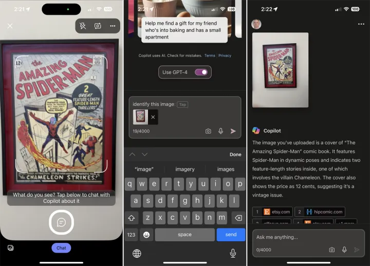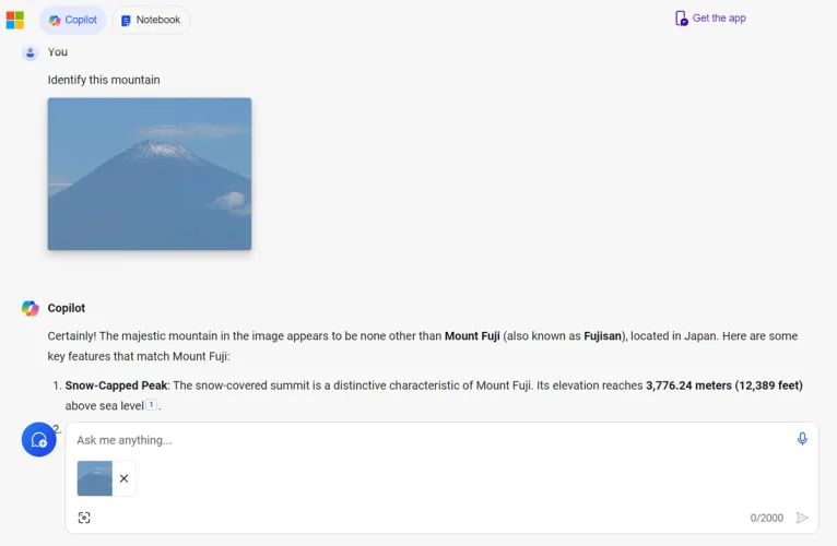 你也可以拍一张照片或上传一张图像到Copilot,让AI分析它。在Windows中,在Edge侧边栏或从网站上,单击图像图标,然后选择从该设备上传。要拍摄新照片,请点击图像图标,然后选择拍摄照片。