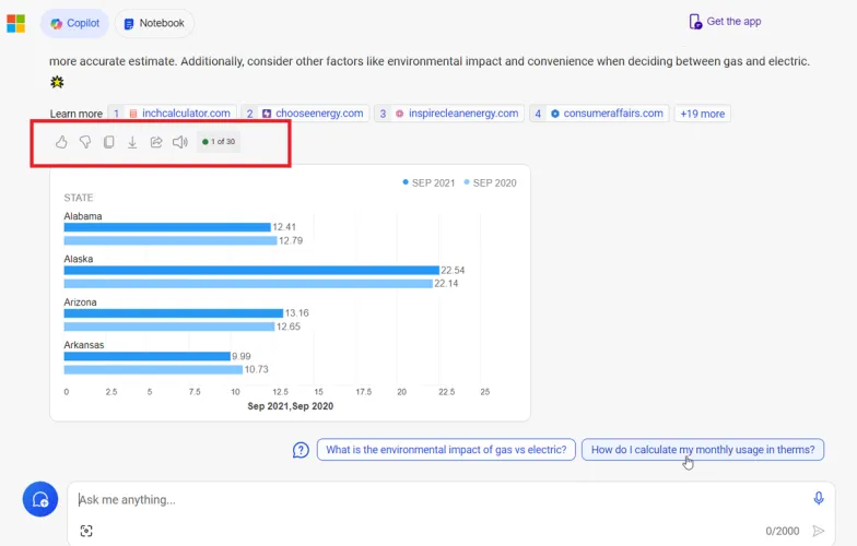 当Copilot回应你的一个请求时,它通常会建议你提出后续问题,如果你想更深入地研究相关领域,你可以问这些问题。点击其中一个后续问题提交。在使用外部来源生成响应时,Copilot将列出并链接到所使用的来源。如果您想要进一步调查,请点击特定的在线来源。