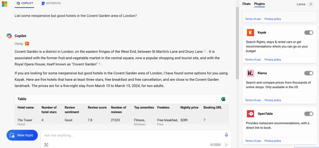 要使用插件,请单击右侧的插件标题。目前的阵容包括Insta、Kayak、Klarna、Shop和Suno等选项。除了默认的搜索插件之外,你还可以选择一次最多整合三个插件到你的请求中。在选择您要使用的插件后,在提示符下输入您的问题,Copilot将使用其中一个插件查找并生成必要的信息。
