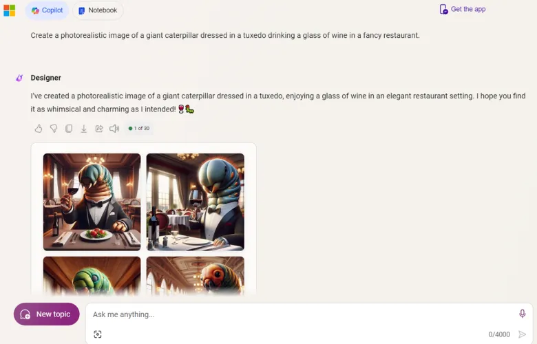 形象创造是Copilot提供的另一项技能,这要归功于它的设计师功能。使用OpenAI的Dall-E 3,Designer将根据您提交的文本生成照片、图纸、徽标和其他类型的图像。你可以在Windows、网站、Edge侧边栏或移动应用程序中尝试这一功能。