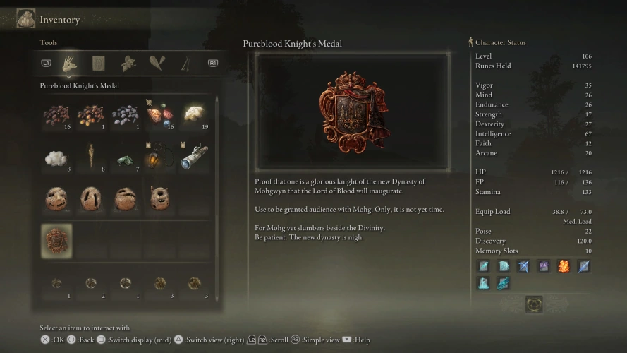 阅读纯血骑士勋章的物品描述,上面写着“还没有到”去见血之王莫格的时候,“因为莫格还在神性旁边沉睡。”要有耐心。新的王朝即将到来。
