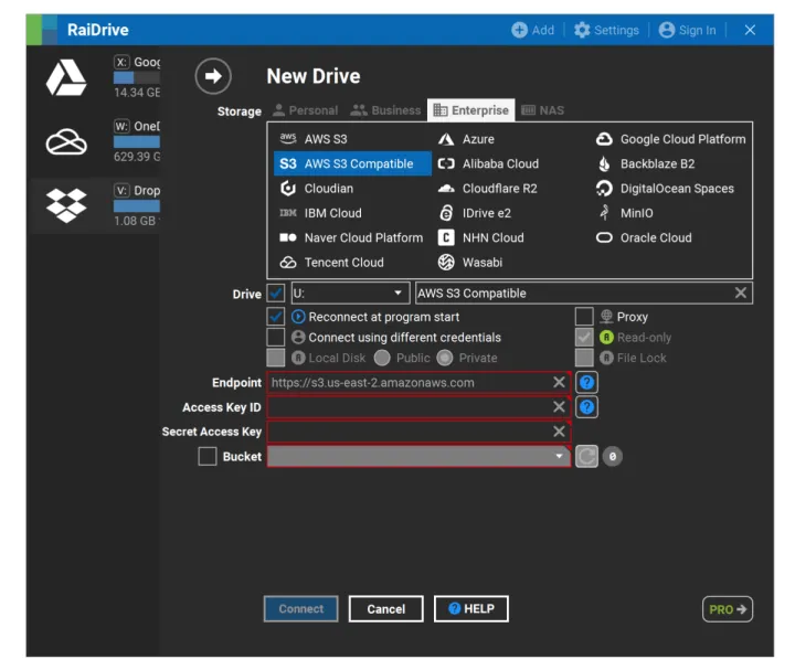 如果服务是S3兼容的,比如Wasabi,你需要从服务的网站创建并获取访问和安全密钥,然后将它们输入云管理器的连接配置对话框中。大多数云管理器实用程序为各种与S3兼容的服务提供模板,这些服务通常包括所谓的服务器端点–即服务存储的网址/URL。