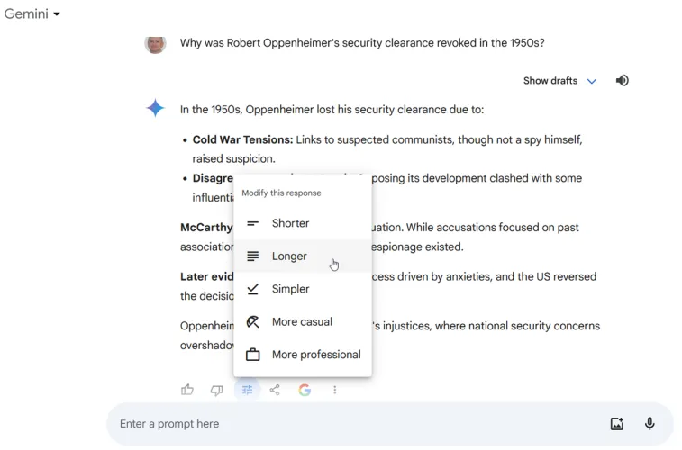 根据你的问题和双子座的回答,你可以告诉人工智能修改回应。如果你要求双子座生成某些内容,这一点尤其有用。提交请求后,转到响应的末尾,然后单击修改响应按钮。在这里,你可以告诉双子座改变回应,让它变得更短、更长、更简单、更随意或更专业。