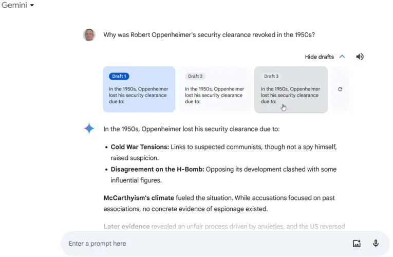 当你要求双子座生成内容时,人工智能会为你提供回应。然而,它也会生成文本的多个草稿。要查看这些替代版本,请单击查看其他草稿下拉菜单。您将看到文本的其他三个草稿;单击您想要查看的一个。您也可以单击重新生成草稿按钮,让双子座创建另外三个草稿。
