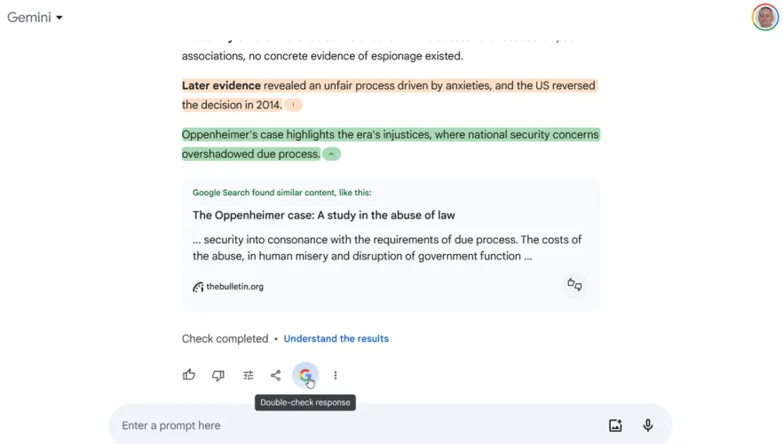 根据回复,您可以就同一主题提出后续问题。或者,点击谷歌图标复查回复,双子座将突出显示具体细节。然后,您可以单击突出显示的文本并访问在线资源。