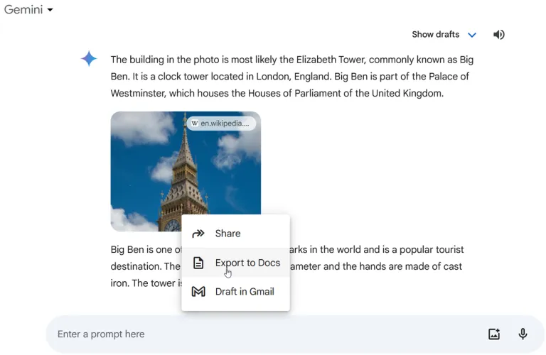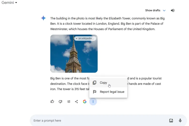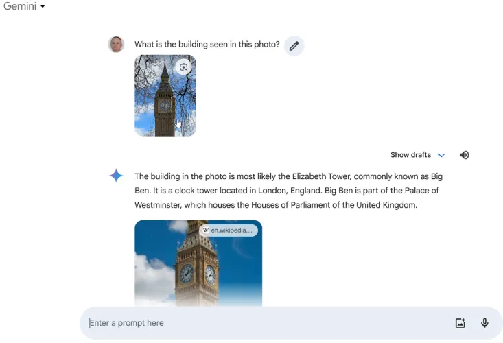 双子座还允许你上传一张图片来获取相关信息。要执行此操作,请单击提示左侧的上载文件按钮并选择图像。该文件可以是JPG、PNG或WebP格式。上传图像后,根据您希望双子座提供的有关图像的详细信息,键入问题或请求,然后单击提交。