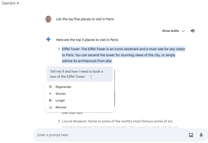 你可以要求双子座修改你选择的具体细节,而不是重新生成整个回应。要执行此操作,请在回复中选择要调整的特定文本。单击修改选定文本,然后从四个默认选项中选择一个:重新生成、较短、较长或删除。