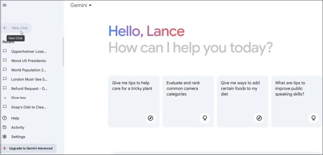 选择其中一个样本问题,等待回答。从这里,您可以继续就同一主题提出后续问题。如果您希望切换到不同的主题,请单击左侧边栏顶部的New Chat按钮。还有几种方法可以改善双子座的反应,以更好地利用AI聊天机器人。