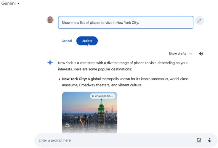 对回答不满意吗?您可以重新表述原始请求,然后重试。将鼠标悬停在问题上,然后单击右侧的编辑文本图标。更改文本并单击更新按钮以接收新的回复。