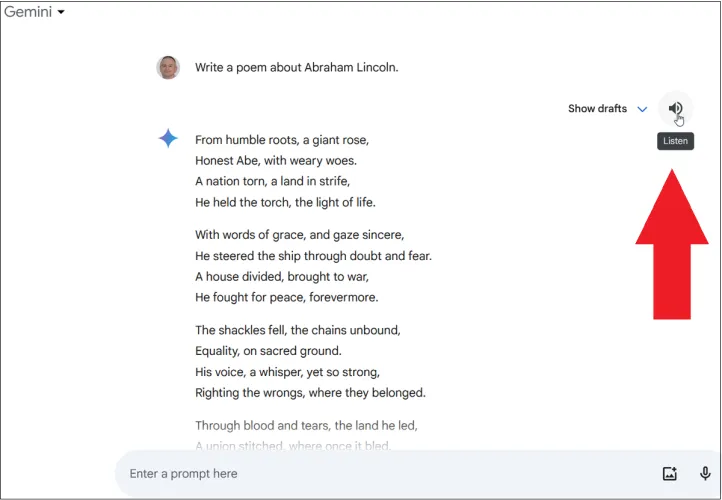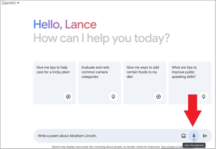 接下来,尝试通过语音提交问题或请求。单击提示符中的麦克风图标。第一次这样做时,你可能需要允许双子座使用你的麦克风。说出您的请求,然后单击提交图标。