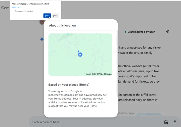 要进行此设置,请查看左边栏底部列出的城市,然后单击更新位置。单击允许以允许双子座访问您的位置。在About This Location(关于此位置)窗口,单击Use Precision Location(使用精确位置)。位置下的链接将从您的IP地址更改为您的设备。你现在可以使用双子座来获取附近地点和活动的信息。