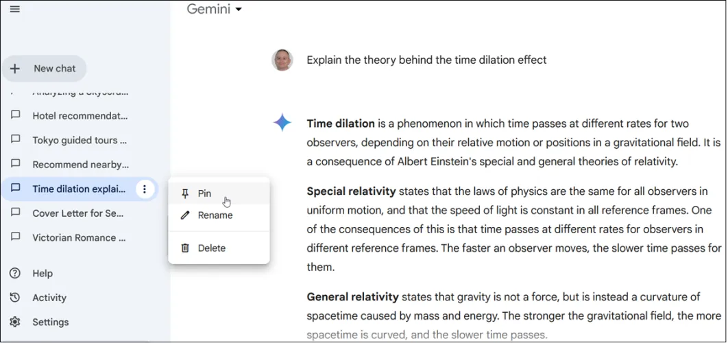 双子座还允许你管理你所有的聊天。左侧栏显示对话的历史记录。单击显示更多以查看全部内容。选择一个特定的对话来查看它,并从您停止的地方继续对话。点击特定聊天的三点图标,即可锁定、重命名或删除该聊天。