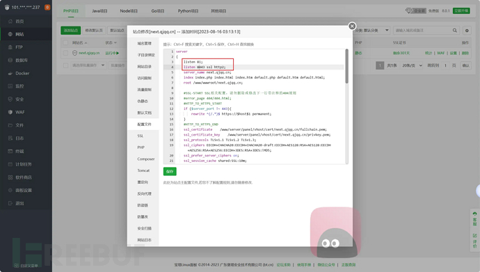 server { listen 81; server_name 127.0.0.1; allow 127.0.0.1; location /nginx_status { stub_status on; access_log off; } location /phpfpm_52_status { fastcgi_pass unix:/tmp/php-cgi-52.sock; include fastcgi_params; fastcgi_param SCRIPT_FILENAME $fastcgi_script_name; } location /phpfpm_53_status { fastcgi_pass unix:/tmp/php-cgi-53.sock; include fastcgi_params; fastcgi_param SCRIPT_FILENAME $fastcgi_script_name; } location /phpfpm_54_status { fastcgi_pass unix:/tmp/php-cgi-54.sock; include fastcgi_params; fastcgi_param SCRIPT_FILENAME $fastcgi_script_name; } location /phpfpm_55_status { fastcgi_pass unix:/tmp/php-cgi-55.sock; include fastcgi_params; fastcgi_param SCRIPT_FILENAME $fastcgi_script_name; } location /phpfpm_56_status { fastcgi_pass unix:/tmp/php-cgi-56.sock; include fastcgi_params; fastcgi_param SCRIPT_FILENAME $fastcgi_script_name; } location /phpfpm_70_status { fastcgi_pass unix:/tmp/php-cgi-70.sock; include fastcgi_params; fastcgi_param SCRIPT_FILENAME $fastcgi_script_name; } location /phpfpm_71_status { fastcgi_pass unix:/tmp/php-cgi-71.sock; include fastcgi_params; fastcgi_param SCRIPT_FILENAME $fastcgi_script_name; } location /phpfpm_72_status { fastcgi_pass unix:/tmp/php-cgi-72.sock; include fastcgi_params; fastcgi_param SCRIPT_FILENAME $fastcgi_script_name; } location /phpfpm_73_status { fastcgi_pass unix:/tmp/php-cgi-73.sock; include fastcgi_params; fastcgi_param SCRIPT_FILENAME $fastcgi_script_name; } location /phpfpm_74_status { fastcgi_pass unix:/tmp/php-cgi-74.sock; include fastcgi_params; fastcgi_param SCRIPT_FILENAME $fastcgi_script_name; } location /phpfpm_75_status { fastcgi_pass unix:/tmp/php-cgi-75.sock; include fastcgi_params; fastcgi_param SCRIPT_FILENAME $fastcgi_script_name; } location /phpfpm_80_status { fastcgi_pass unix:/tmp/php-cgi-80.sock; include fastcgi_params; fastcgi_param SCRIPT_FILENAME $fastcgi_script_name; } location /phpfpm_81_status { fastcgi_pass unix:/tmp/php-cgi-81.sock; include fastcgi_params; fastcgi_param SCRIPT_FILENAME $fastcgi_script_name; } location /phpfpm_82_status { fastcgi_pass unix:/tmp/php-cgi-82.sock; include fastcgi_params; fastcgi_param SCRIPT_FILENAME $fastcgi_script_name; }}更改完成后需要到nginx面板去重载配置以及重启操作!以防万一这两项操作必须都进行!