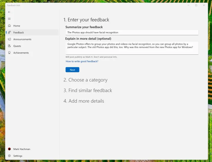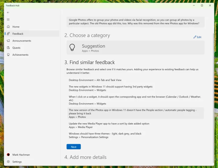 当然,你可能不是第一个有这种特别抱怨或建议的人。然后,微软会指示你“寻找类似的反馈”,这可能会将你的反馈与之并列。