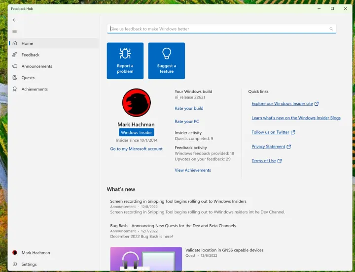 反馈中心出现在主屏幕上,在存在了几年后,它真的需要重新进行视觉设计。有两个突出的按钮:“报告问题”和“建议一个功能”。该页面还将报告您参与Windows社区的其他元素,包括您是否参与了Insider计划。一个方便的功能是Windows团队最近发布的一系列声明,宣布了新功能(通常是给内部人士)以及任何新的Insider版本。