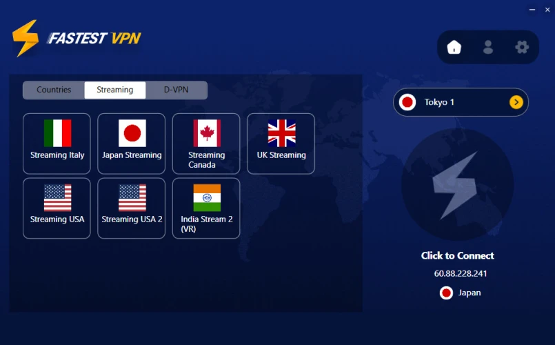 自我们上次回顾以来,FastestVPN再次升级了其应用程序的设计,使其更简单、更易于跨设备使用。第一次在Windows中打开应用程序时,你会在主屏幕中找到可以连接到的国家/地区的列表,这使得立即开始使用变得很容易。在右边,你会发现FastestVPN商标的闪电按钮,以及关于连接的基本信息(IP地址和服务器位置)。在右上角,你将有三个按钮,分别用于主屏幕、账户信息和设置。